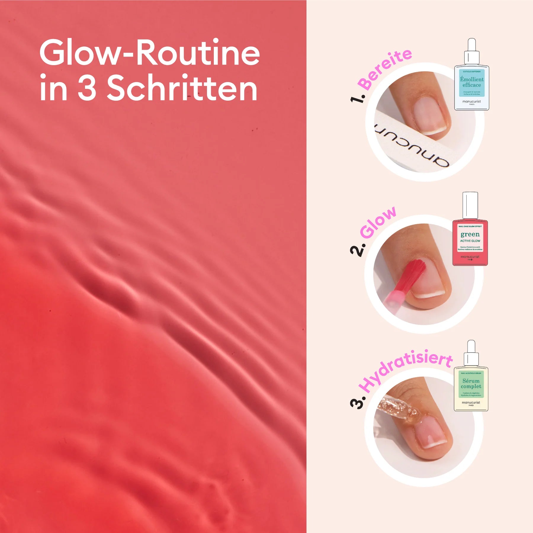 Eine Pflegeroutine in drei Schritten mit allem, was für die Vorbereitung erforderlich ist: eine Feile, eine Vorbereitungs-Feile und ein Nagelhauterweicher, der Pflegelack und Bestseller Active Glow™ mit Gloss-Effekt und das Komplett-Serum, um Nägel und Nagelhäute vorzubereiten, zu pflegen und tiefenwirksam mit Feuchtigkeit zu versorgen.