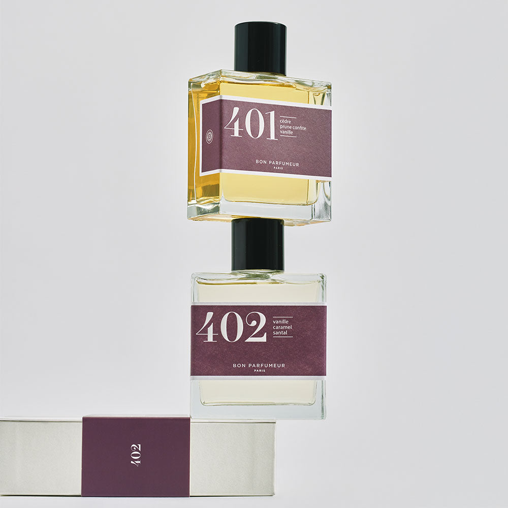 402 Bon Parfumeur - ein Gourmet-Parfüm, das auf der Vanilleschote basiert. Das 402 öffnet sich zu weichen, weißen Blumen und Mandelnoten. Der Heliotrop bietet eine milchige und zuckerüberzogene Facette. Die Basisnote ist leicht würzig, erwärmt durch die Sandelholz- und Benzoe-Noten. Ein Gefühl eines köstlichen Desserts.