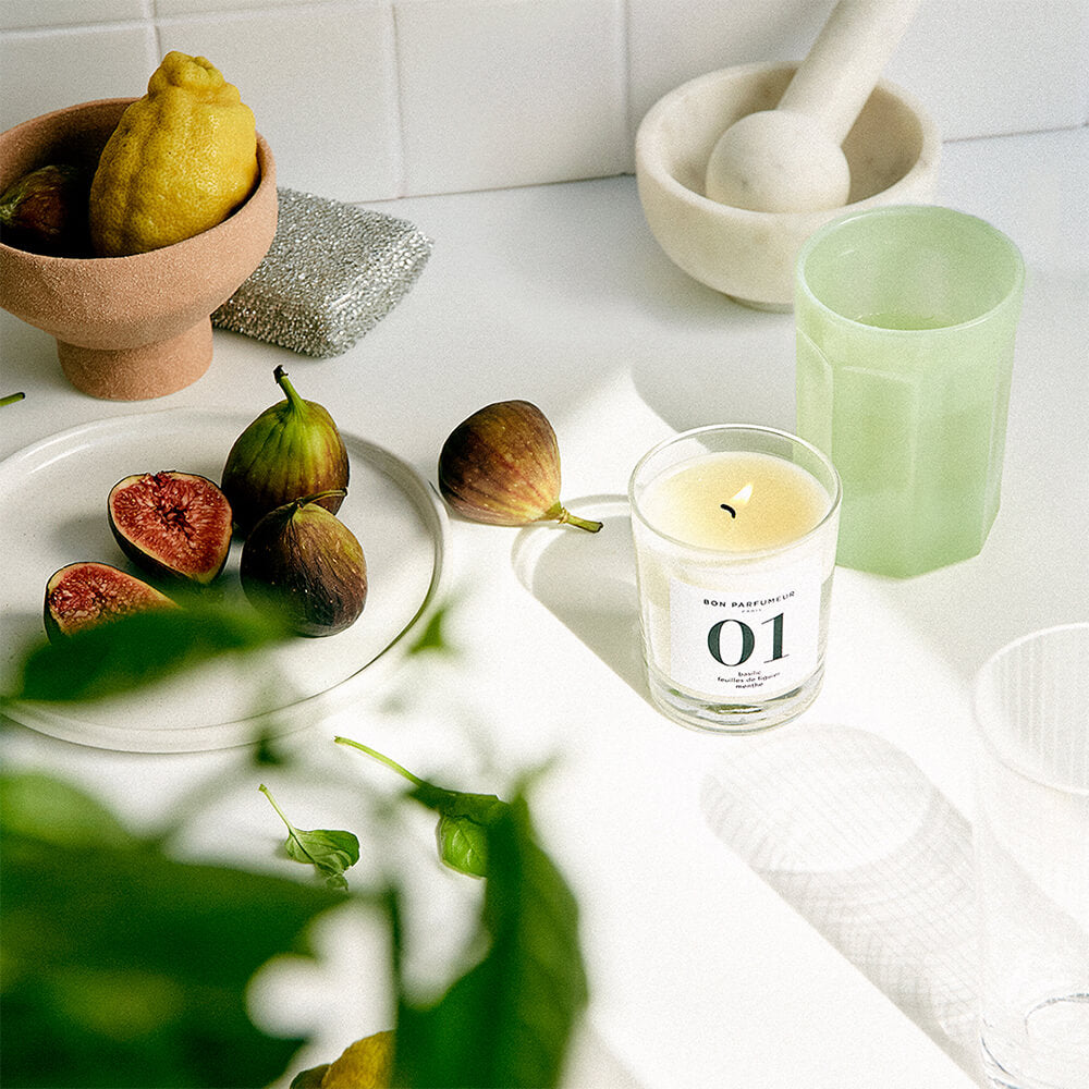 01 ist eine Kerze mit zarten Düften von Basilikum, Minze und Feigenblättern, die eine spritzige grüne und aromatische Frische verleiht. Die Kopfnote besticht durch die Süße und Herbheit der brasilianischen Orange. Das Herz wird belebt durch blauen Eukalyptus. Die Basisnote wird schließlich mit Vanille abgerundet.
