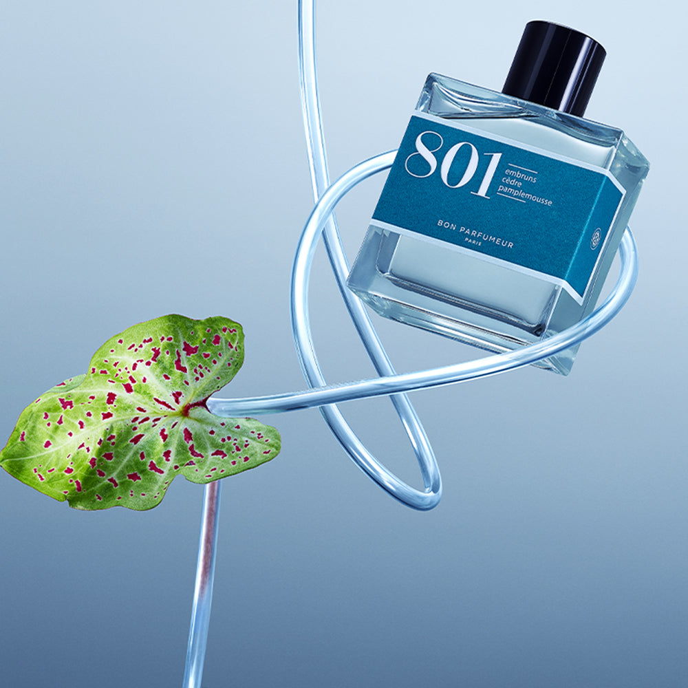 Die 801 ist eine aquatische Zitrusfrucht. Die Noten von Grapefruit und Zitrone verstärken die Meeresfrische. Die luftigen Facetten verbinden sich gut mit den würzigen und aromatischen Akzenten und verleihen der Komposition ihren ganzen Charakter. Sein pudriger Sog ist mit trockenem Holz und weißem Moschus gefüllt.