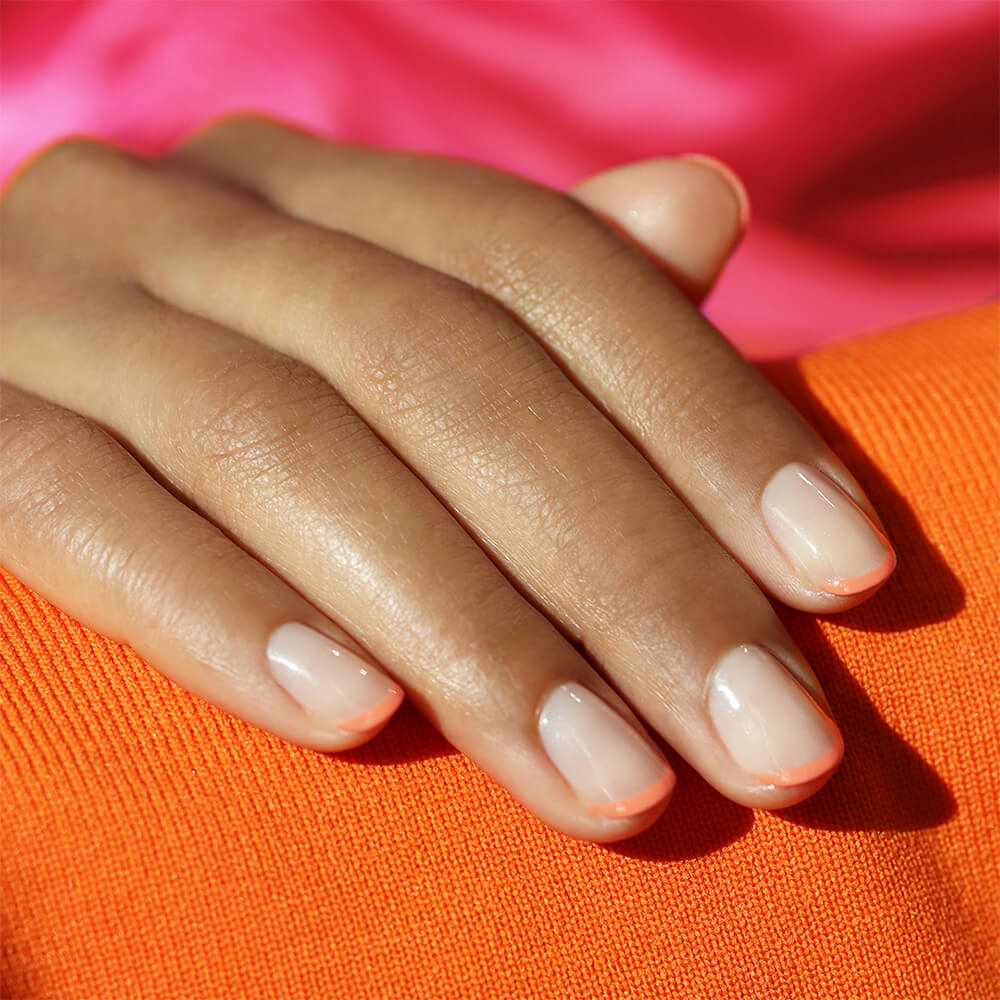 Um die Maniküre abzuschließen, trage den Green Flash Top Coat dünn auf, auch auf den vorderen Rand, und härte erneut mit der Lampe aus.